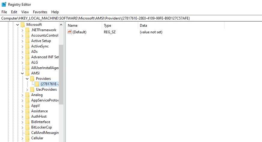 HKLM:\SOFTWARE\Microsoft\AMSI\Providers\{2781761E-28E0-4109-99FE-B9D127C57AFE}