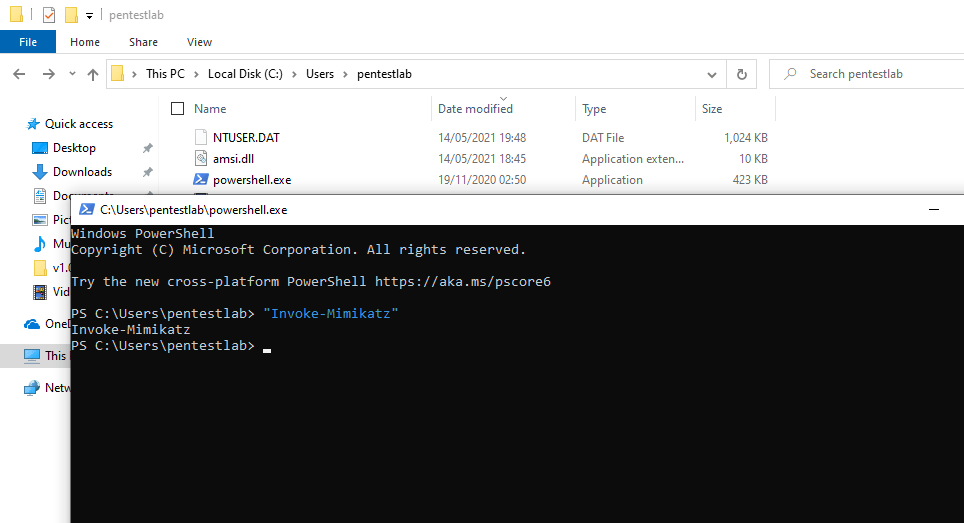 DLL Hijacking can be also used to evade AMSI from userland as it has been described by SensePost. The only requirement is to create a non-legitimate amsi.dll file and plant it on the same folder as PowerShell 64 bit which could be copied to a user writable directory. The proof of concept code has been released by SensePost and is also demonstrated below.