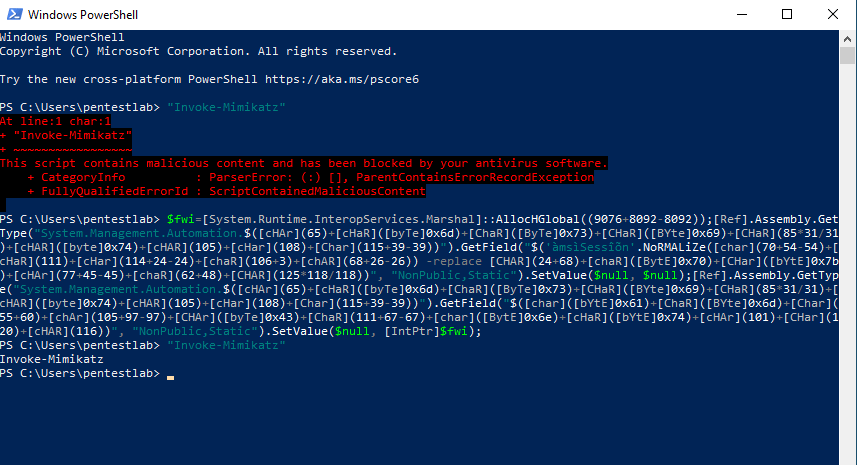 Since there is a signature for the “amsiInitFailed” flag, Adam Chester discovered an alternative method which attempt to force a error in order the flag to be set in a legitimate way and not in the console. This bypass allocates a memory region for the “amsiContext” and since the “amsiSession” is set to null will result an error. The discovery has been described in the article “Exploring PowerShell AMSI and Logging Evasion” in the MDSec website. Using this evasion without any obfuscation will fail as Microsoft has created signatures.