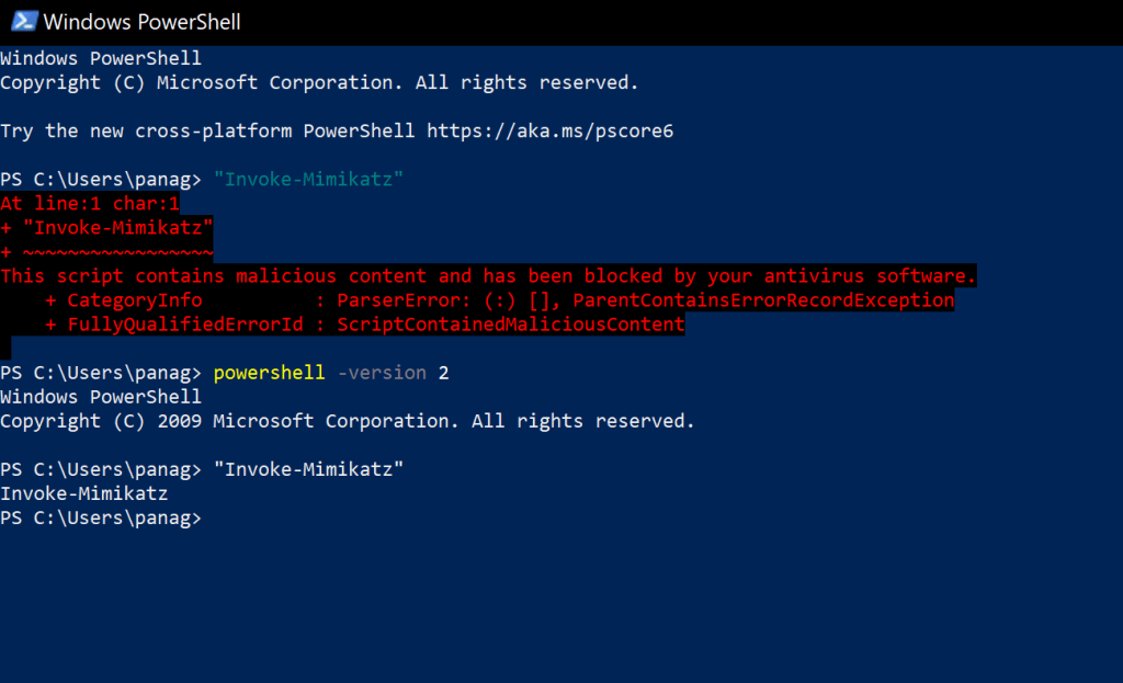 Even though that Windows PowerShell 2.0 has been deprecated by Microsoft it hasn’t been removed from the operating system. Older versions of PowerShell doesn’t contain security controls such as AMSI protection and could be utilized as a form of evasion. Downgrading the PowerShell version to an older version is trivial and requires execution of the following command: